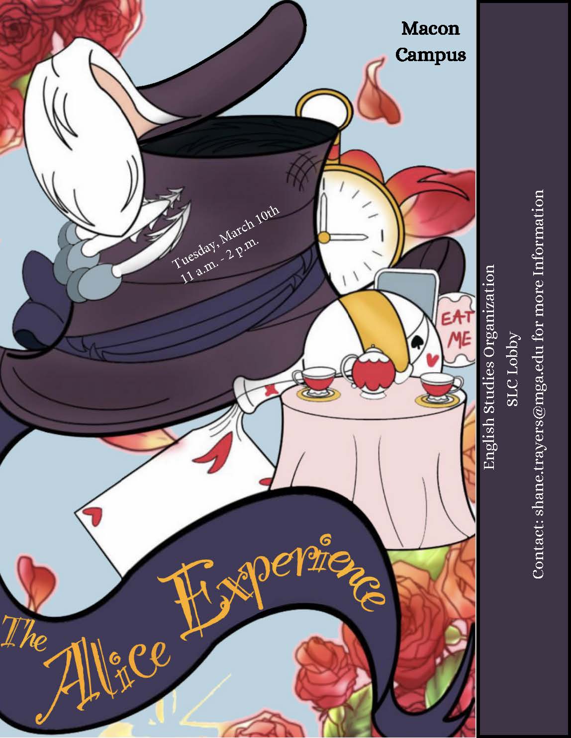 The Alice Experience Time: 11:00-2:00PM The Alice Experience is an interactive Alice in Wonderland where students can play croquet with a flamingo and hedgehog, take on a Jabberwocky, attend a Mad Tea Party and similar activities. It allows people to really get inside the classic children's tale. Contact: Dr. Shane Trayers
