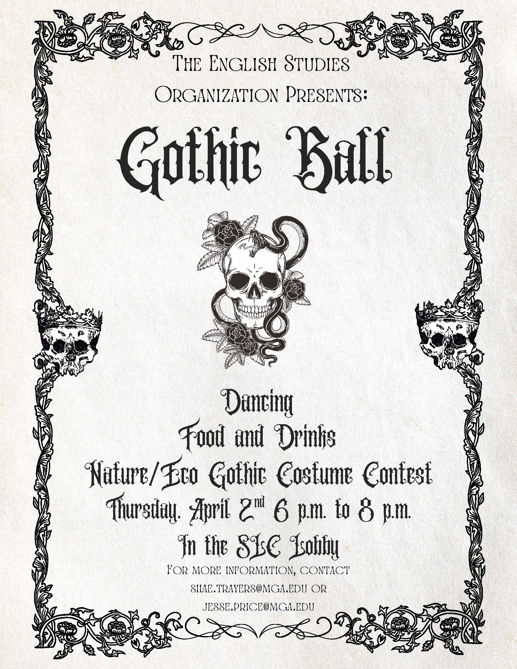 ESO Annual Gothic Masquerade Ball Time: 6:00PM-8:00PM Come in your best Gothic outfit (or not) to English Studies Organization's Gothic Masquerade Ball. There will be masks provided, dancing, costume contest and more. This event has been called "better than prom"! Contact: Dr. Shane Trayers