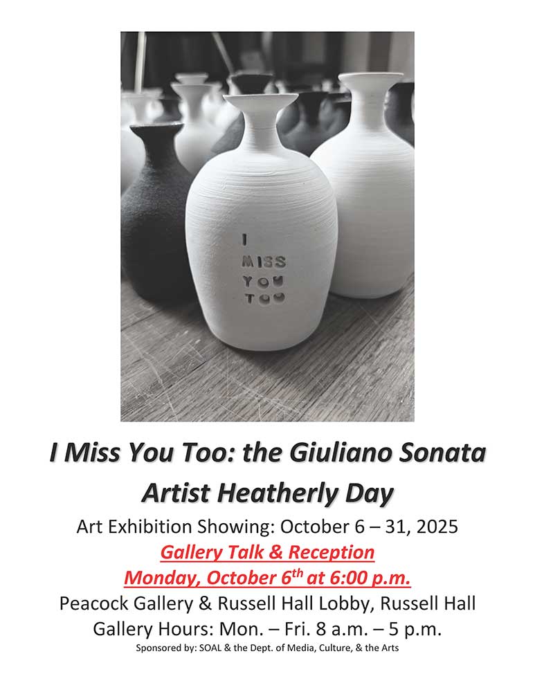 I Miss You Too: the Giuliano Sonata, Artist Heatherly Day Time: All Day Gallery Talk and Reception, October 6, 2025 at 6:00PM Contact: Charlie Agnew |