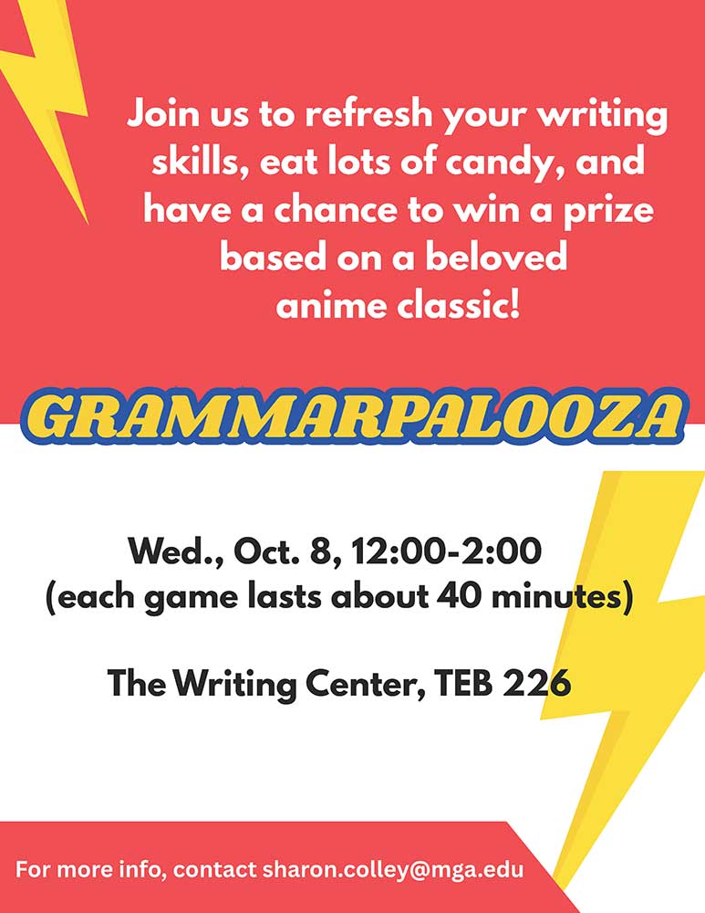 Grammarpalooza Time: 12:00PM Grammarpalooza is The Writing Center's regular semester writing refresher. We review basic writing skills for core students in an interactive, social game featuring a drawing for prizes and way too much candy. Faculty will be notified of student attendance. Contact: Dr. Sharon Colley |