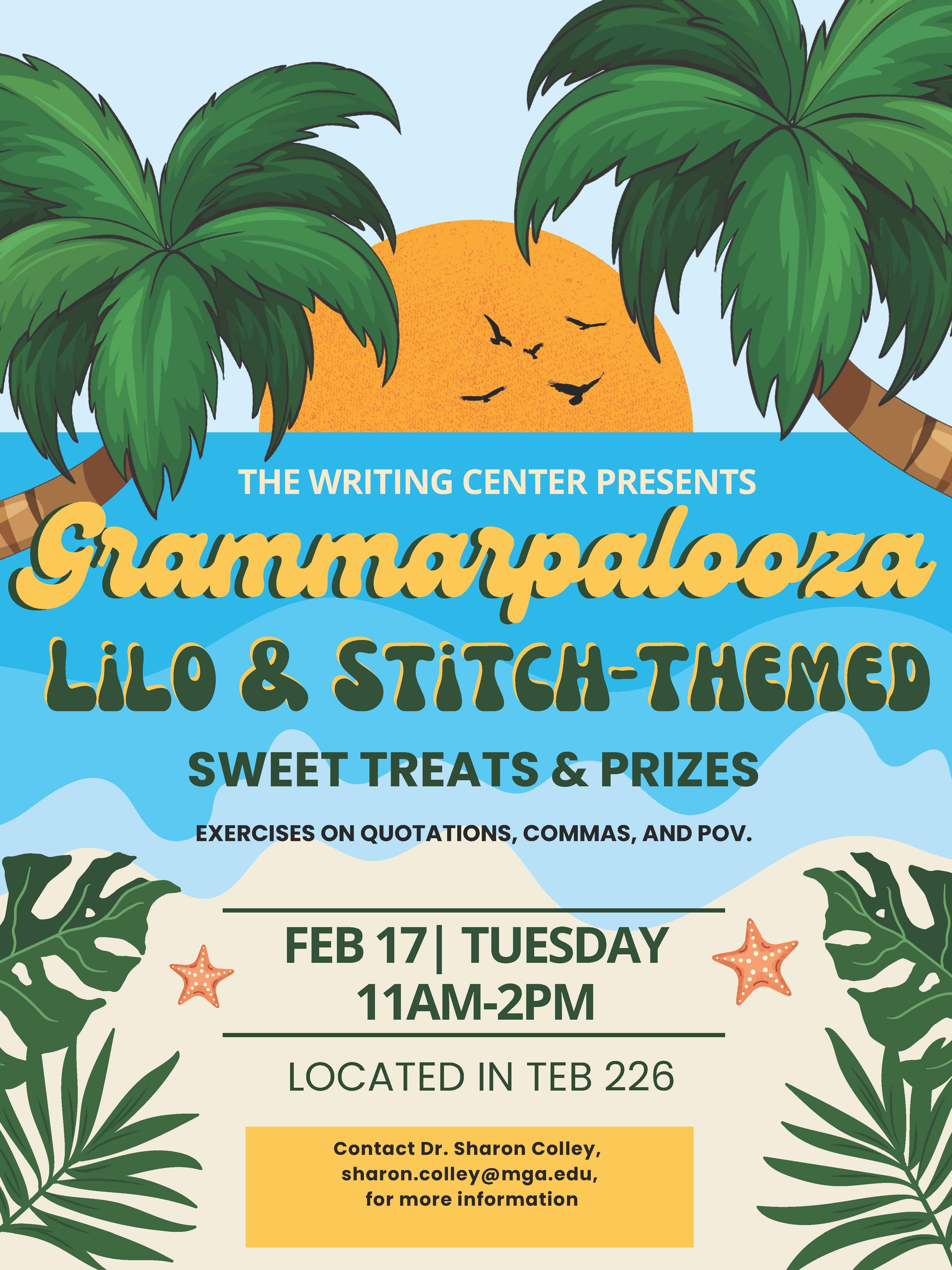 Grammarpalooza - Lilo & Stitch Themed Time: 11:00AM-1:00PM Grammarpalooza is The Writing Center, Macon's regular semester writing refresher. Students complete basic writing exercises on the semester's theme and are then entered in a drawing for prizes. The game is social, with conversations encouraged and way too much candy provided. Faculty members can be notified of student attendance. Contact: Dr. Sharon Colley