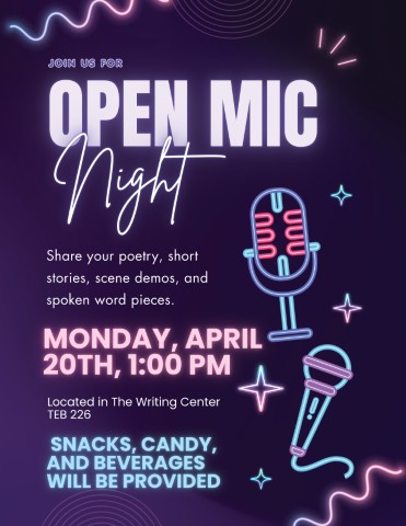 Open Mic Night Time: 1:00PM Share your poetry, short stories, scene demos, and spoken word pieces, 0r just listen to other folks' work and eat snacks.