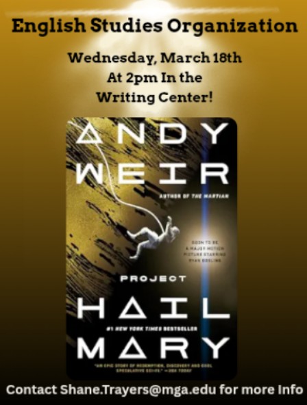 ESO Book Discussion - Project Hail Mary by Andy Weir Time: 2:00PM-3:00PM This is a student led, informal discussion of the book Project Hail Mary by Andy Weir. Book discussions are fun and informal. Contact: Dr. Shane Trayers