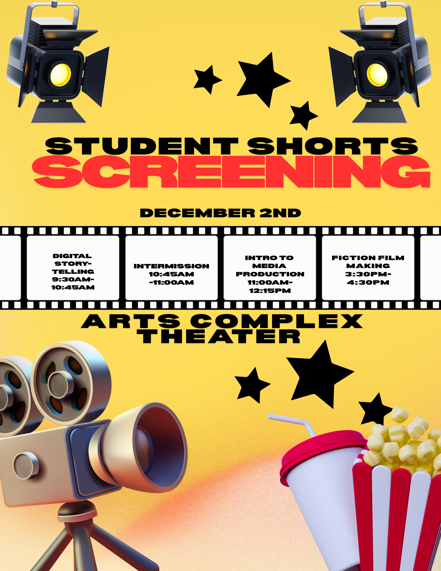 Student Film Shorts Screening Time: 9:30AM-12:15PM and 3:30Pm-4:30PM Students from Intro to Media Production, Digital Storytelling, and Fiction Film Making present their final projects on the big screen!