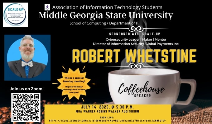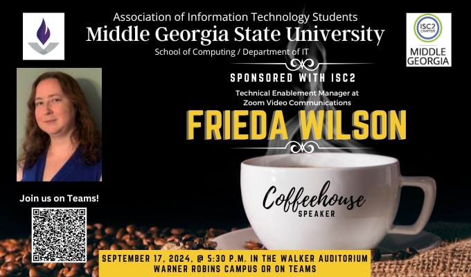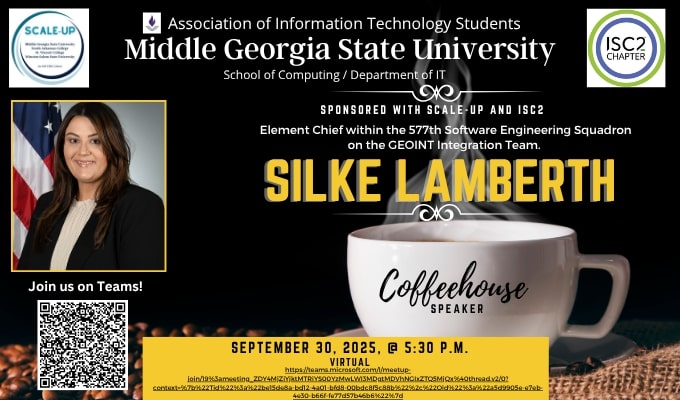 The Association of Information Technology Students (AITS) and the Middle Georgia Chapter of ISC2, a professional organization focused on cybersecurity, are sponsoring monthly speaker events. These events will take place at the MGA Warner Robins Campus in the Walker Auditorium.