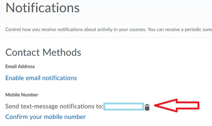 - Click on the trash icon next to your phone number. Click "Yes" on the confirmation screen. This number will no longer receive notifications from D2L Brightspace.