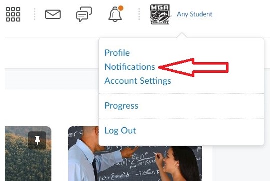- From the My Home page on D2L Brightspace, click on the profile icon next to your name from the top menu bar. Click on "Notifications."