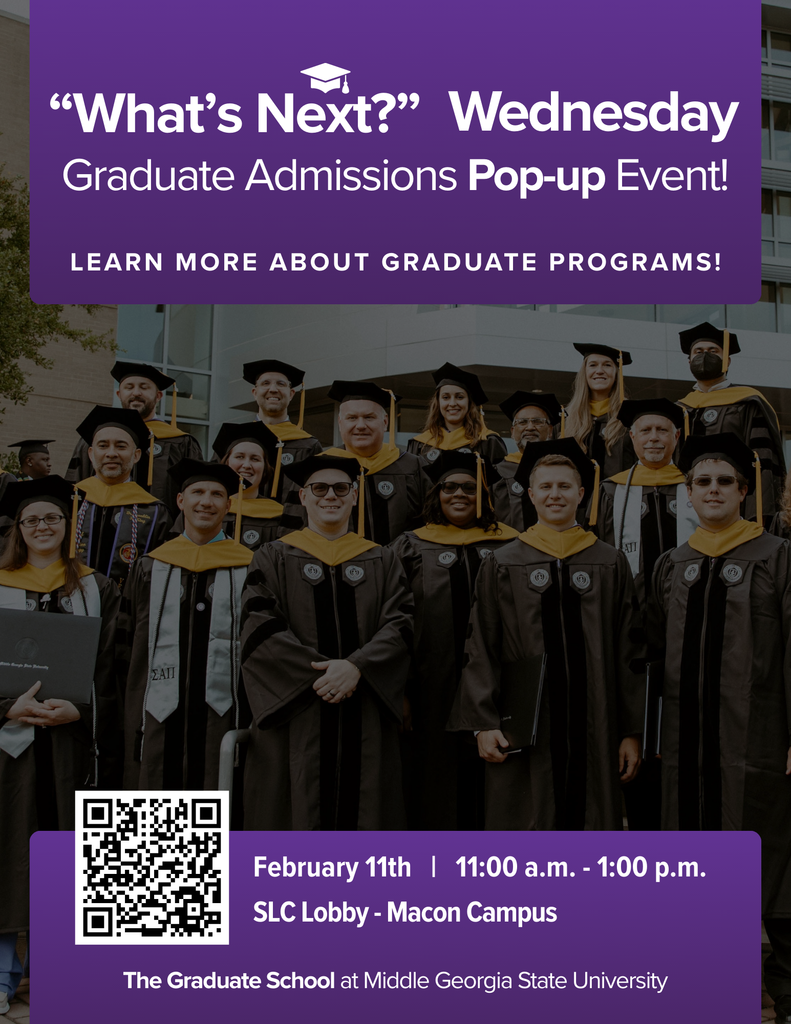 Graduate Admissions Pop-Up Event: "What's Next?" Wednesday Location: MGA Macon Campus, Student Life Center Lobby Stop by our table in the Student Life Center and speak with a Graduate Admissions representative about what's next for your educational journey! |